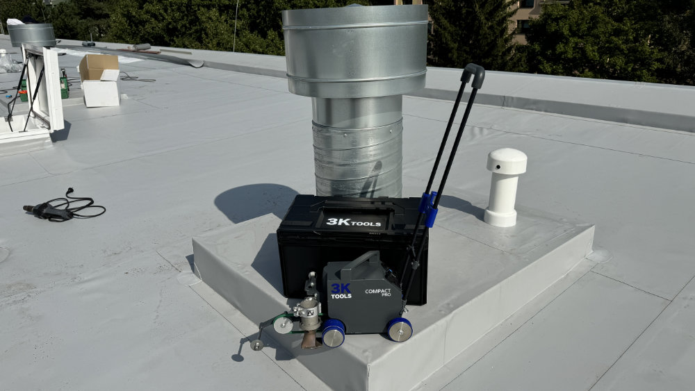 De COMPACT PRO is een handig folielasapparaat op batterij. Dit lichtgewicht en tevens robuuste apparaat is de ideale keuze voor het lassen van PVC/TPO folies op platte daken, zwembaden, groendaken, etc.. Dit toestel rijdt automatisch verder van zodra de heteluchtblazer op haar plaats geschoven wordt. De meeste heteluchtblazers passen in de behuizing van het toestel.